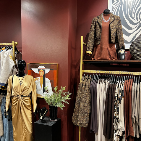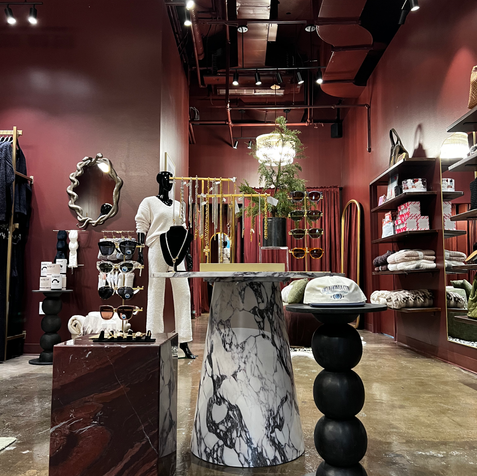 This brand-new retail space was designed to make a bold first impression. We brought the client’s vision to life with a modern, bold aesthetic, layering materials like concrete, furs and gold steel to create a sleek bold vibe. Custom hanging clothing fixture was integrated in the space to highlight key merchandise, adding both function and visual interest. The result is a visually striking environment that perfectly complements the boutique’s contemporary fashion offerings.